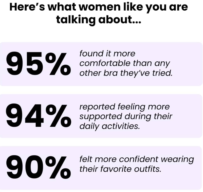 Our bra is designed specifically to address these issues. It’s the ultimate solution for sagging, lack of support, and everyday discomfort. Say goodbye to underwires, tight straps, and bands that ride up. And hello to a bra that truly fits.